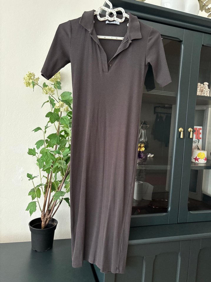 Gri renkte, kısa kollu ve polo yaka detaylı, uzun ve vücuda oturan rahat kesim elbise. Yumuşak sentetik kumaştan yapılmıştır ve gündelik şıklık sunar.