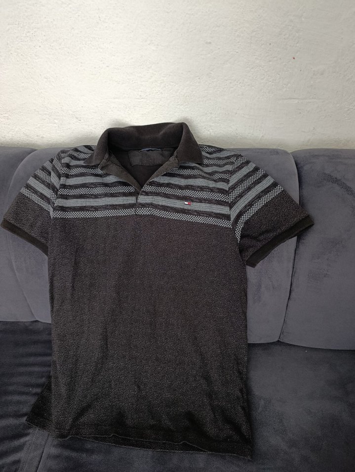 Gri renkli, kısa kollu, yakalı ve düğmeli ön kısmı olan erkek polo tişörtü. Üst kısmında hafif çizgili desen ve yumuşak sentetik kumaş kullanılmış.
