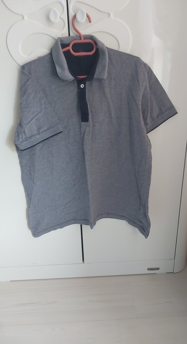 Düğmeli polo yaka ve kısa kollu, bol kesim erkek tişört. Düz gri renkte, sentetik kumaştan, günlük kullanıma uygun rahat bir model.