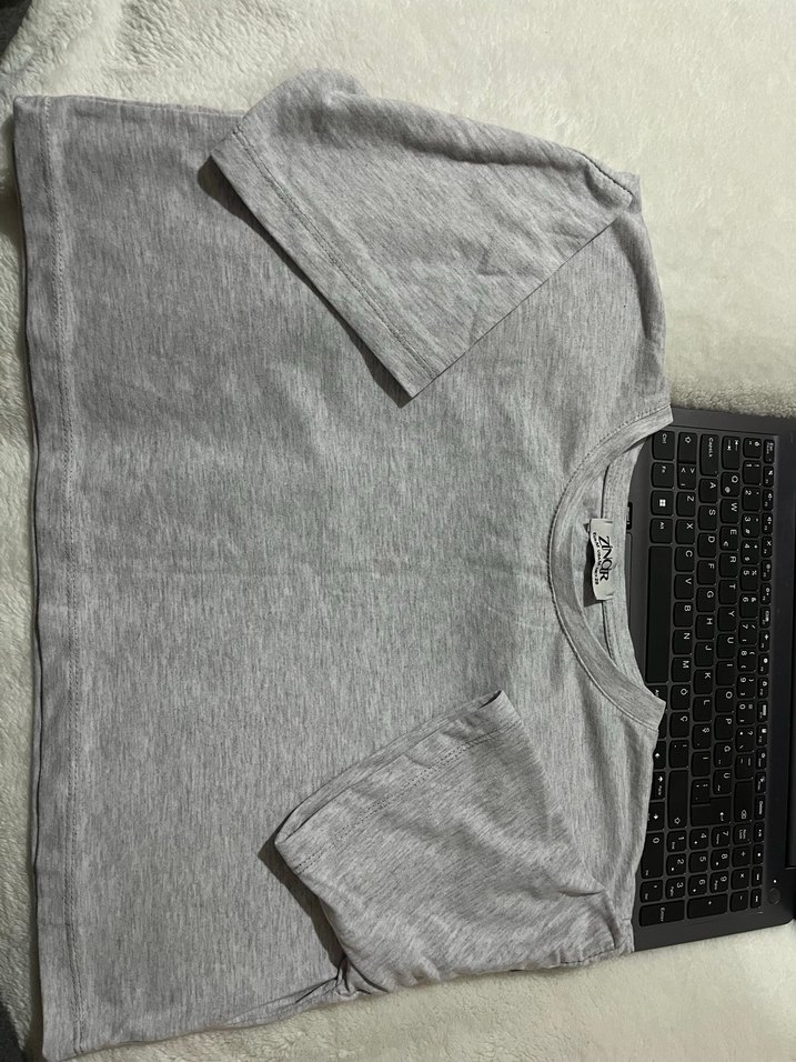 Gri renkte, kısa kollu ve yuvarlak yakalı tişört, rahat kesimi ve yumuşak sentetik kumaşıyla günlük sokak stiline uygundur. Yarım model temiz leke yok.