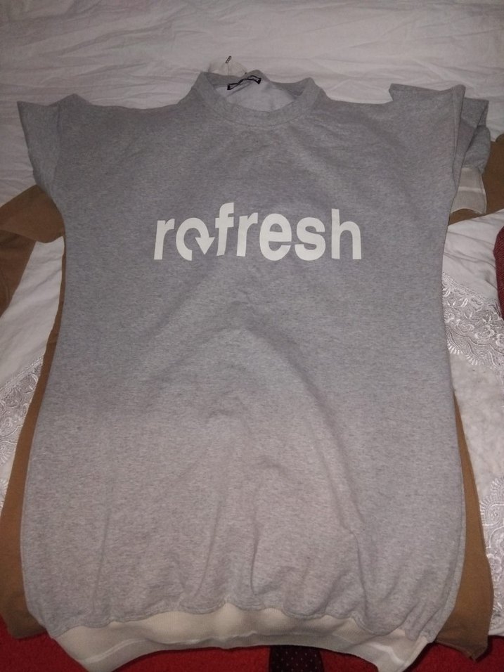 Gri renkli, kısa kollu, yuvarlak yakalı kadın sweatshirt. Sentetik kumaştan, bol kesim ve kısa boy. "rofresh" baskılı ve fırfır detaylıdır.
