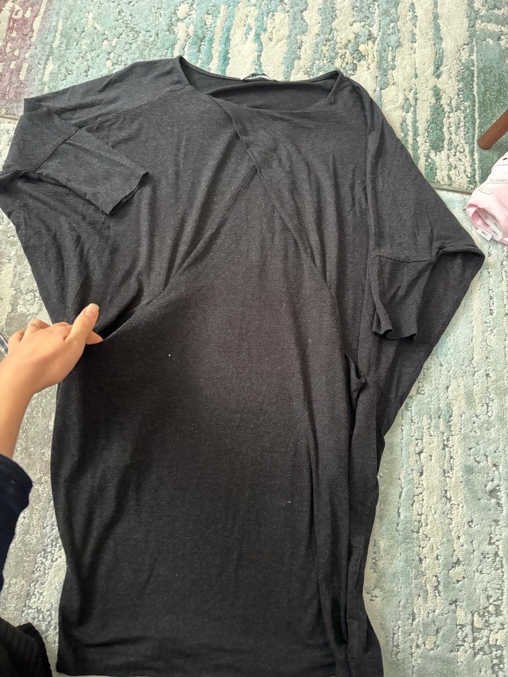 Gri renkte, yarım kollu ve yuvarlak yaka elbise . Salaş kesim ve drapeli tasarımıyla orta boyda, yumuşak pamuklu kumaştan üretilmiştir.