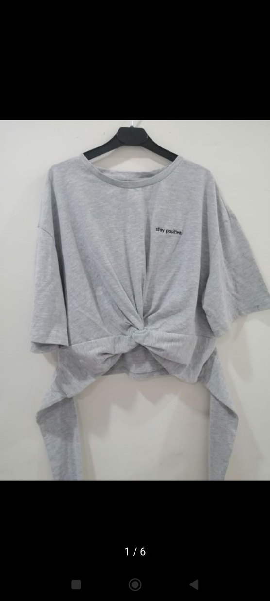 kısa kollu ve yuvarlak yakalıdır. Rahat kesimli, yumuşak keten kumaştan yapılmış, baskılı ve önünde bağlama detayı vardır.