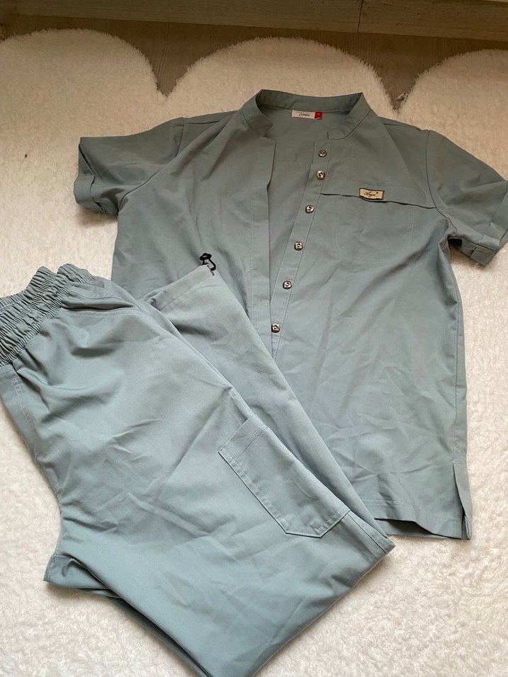 Gri renkli, kısa kollu ve düğmeli ön kısmı olan scrubs hastane kıyafeti, yumuşak sentetik kumaştan yapılmıştır. Lastikli bel pantolon ve sade desensiz tasarım içerir.