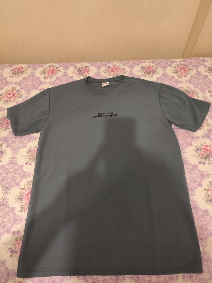 Gri renkli, kısa kollu, yuvarlak yaka ve baskılı detaylı erkek tişörtü. Sentetik kumaştan, rahat kesim ve günlük sokak stili için uygundur.