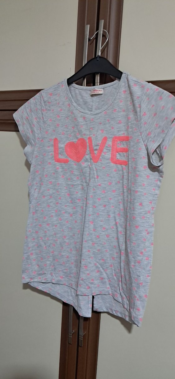 Kız çocuk kısa kollu tişört, pamuklu kumaştan yapılmış, uzun kollu ve yuvarlak yakalı kız çocuk tişörtü. Önünde 'LOVE' baskısı bulunur.