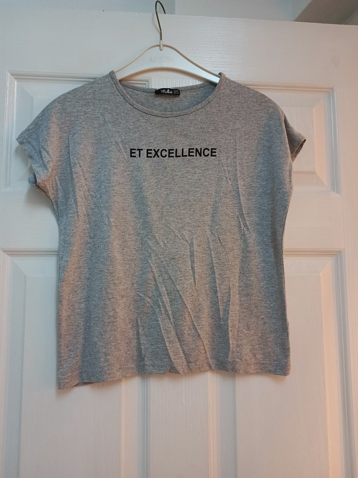 Gri pamuk tişört, yuvarlak yaka ve kısa kollu, bol kesim. Üzerinde 'ET EXCELLENCE' baskısı bulunur, günlük kullanıma uygun rahat şıklık sunar. s beden m'ye de. uygun