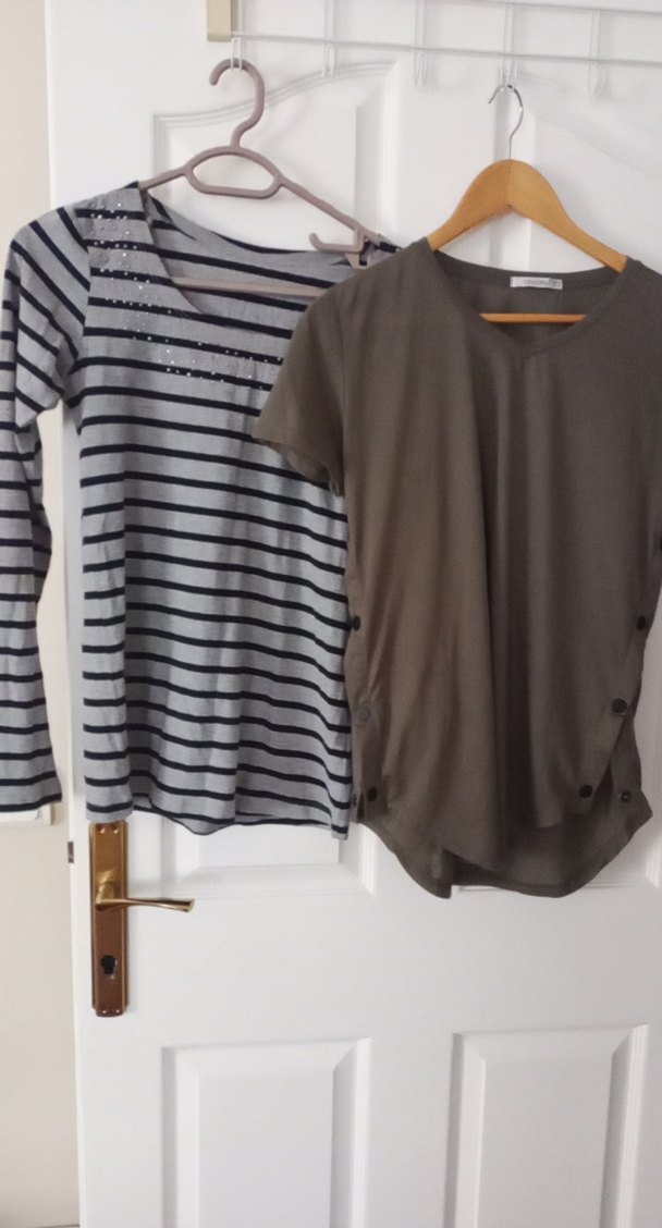 Gri renk, kısa kollu, yuvarlak yaka ve bol kesim tişörtü. Günlük kullanım için rahat ve şık bir seçenek. yesil iki koltuk arası 45 cm boy 68 cm , çizgili iki koltuk arası 44 cm ,boy 66 cm#kadın#tişört#sewet#