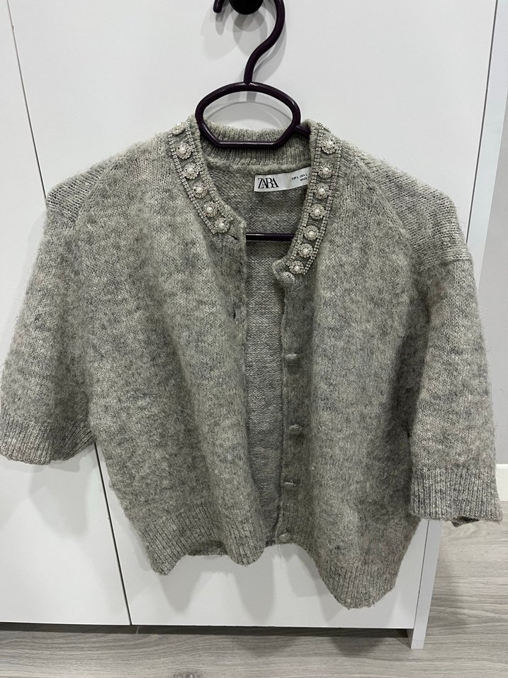 Gri renkte, kısa kollu ve kısa boylu, bol kesim triko hırka. Rahat ve günlük kullanıma uygun bir parça.