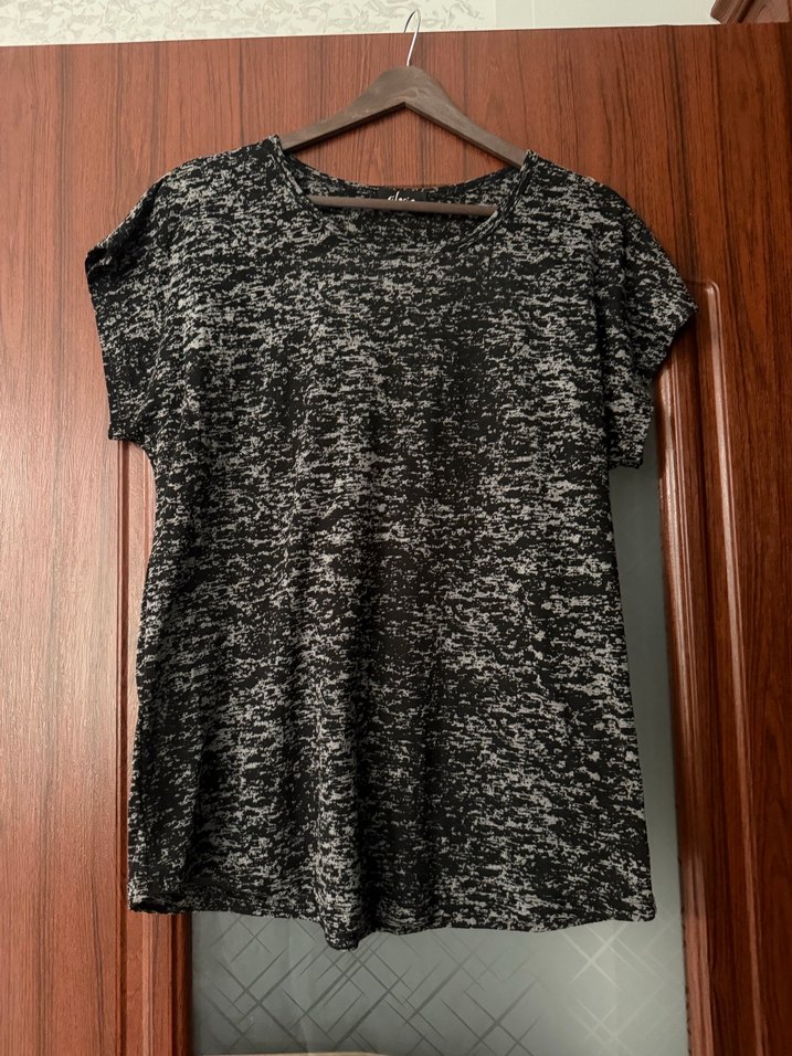 Gri renkte, kısa kollu, yuvarlak yakalı, triko dokulu, normal boyda ve bol kesim kadın bluz.ince iç gösterir