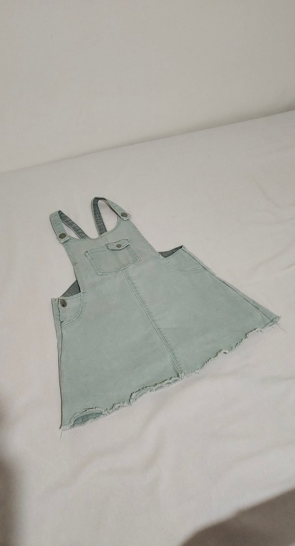 Gri kot kumaştan, askılı, straplez ve bol kesim kısa salopet. Alt kısmı yıpranmış detaylı, rahat ve şık bir model.
