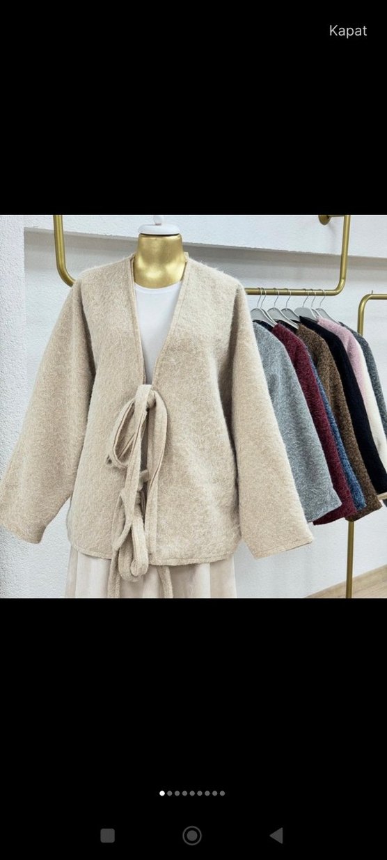 bej i renkli, örgü yün kadın ceket, bol kesim ve uzun kolludur. Kısa boyda, bohem tarzda, önü bağlamalı ve desensizdir.