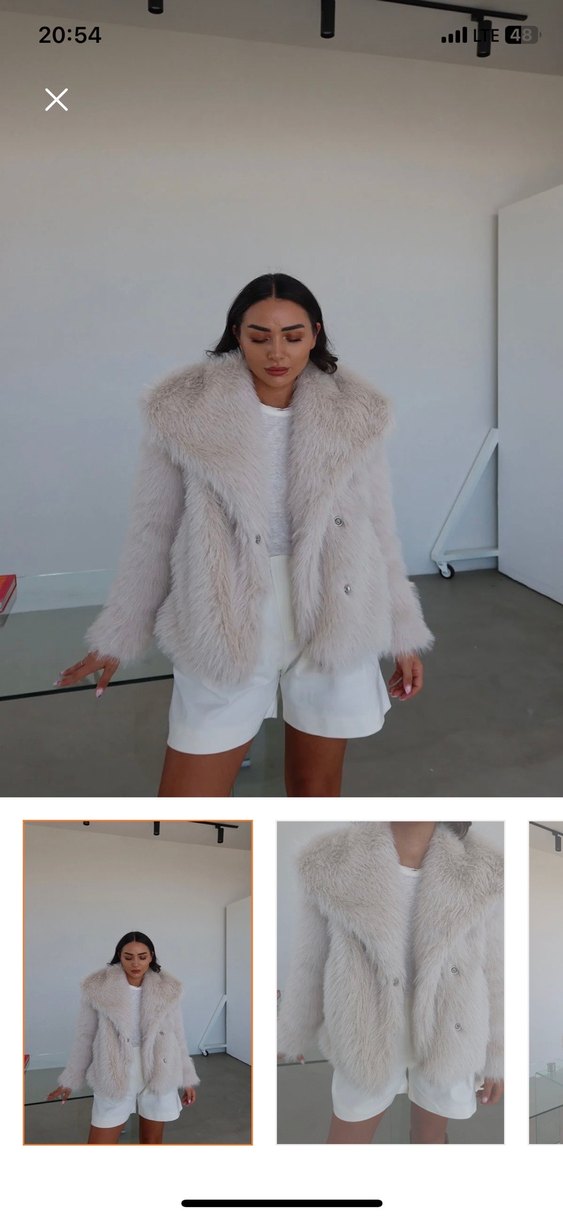 Gri beyaz tonlarında, suni kürk detaylı, kısa ve bol kesim kadın mont. Uzun kollu ve yakası notched lapel, günlük rahat sokak stili için uygun.
