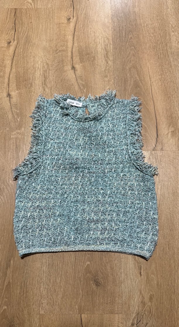 Kolsuz, bol kesim ve yuvarlak yaka tüvit kadın süveter. Yumuşak örgü kumaştan, kısa boyda ve mavi tonlarında bağlama desenli rahat bir model.