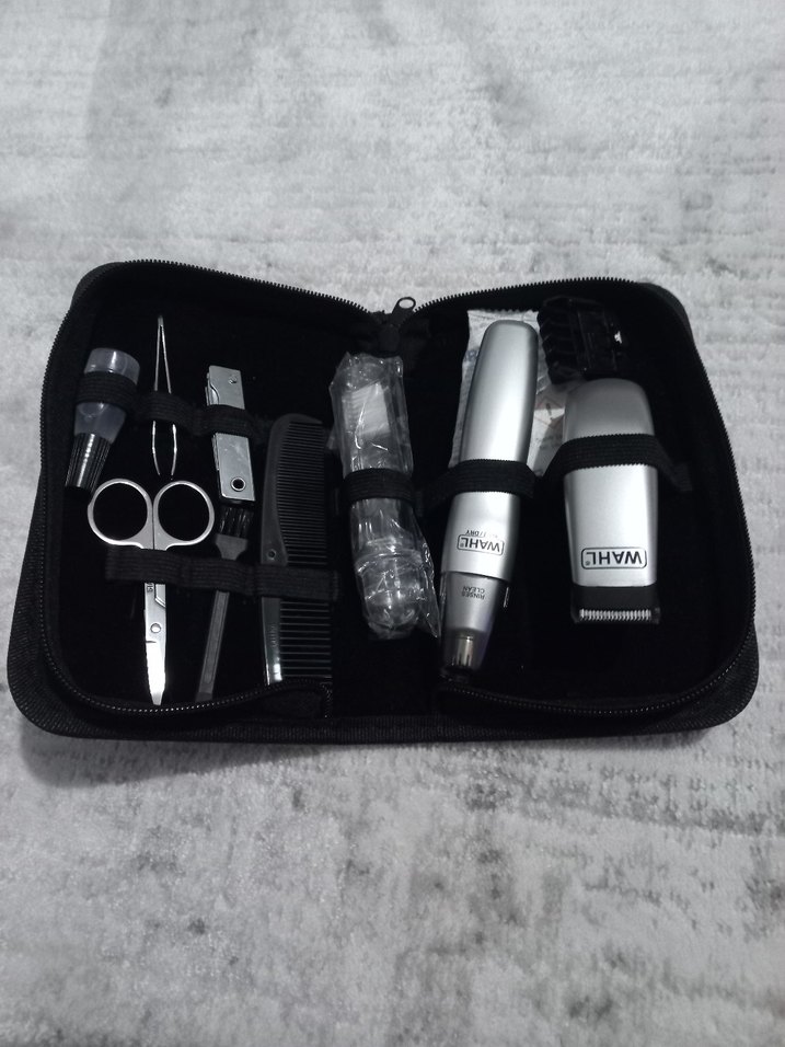 Gri renkte WAHL markalı saç kesme makineleri, makas, tarak ve diğer bakım araçlarını içeren kişisel bakım seti, fermuarlı kutuda düzenlidir. ✂️