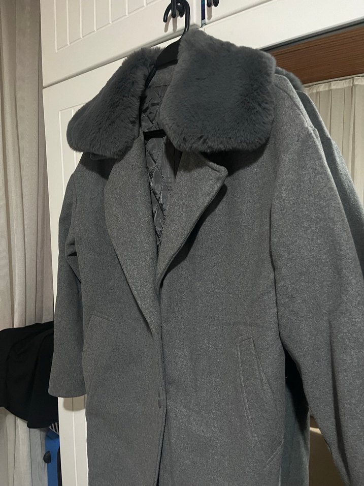 Yumuşak kürk yaka ve kapitone astarıyla gri kışlık kaban. Ön cepler ve düğmeli kapanışa sahiptir. ❄️