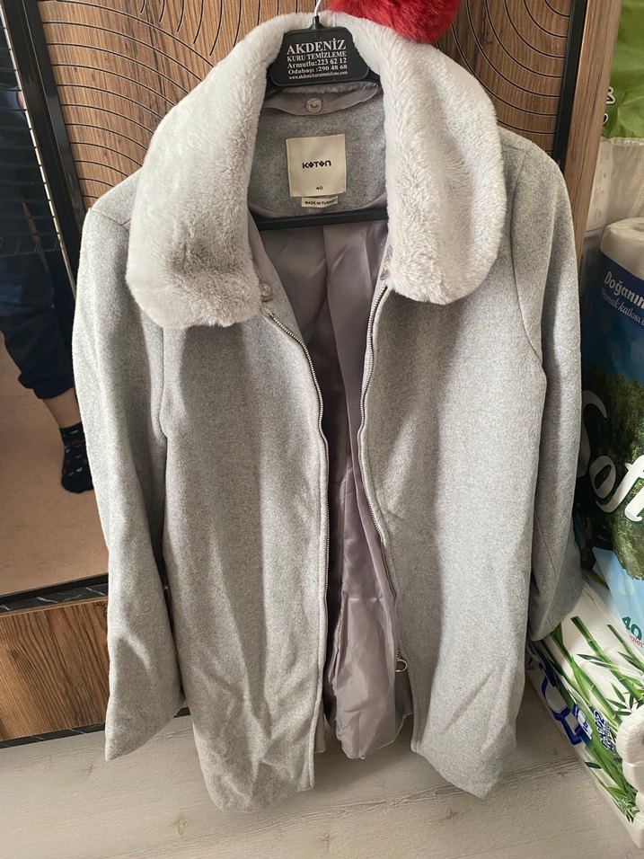 Gri kaban, yumuşak kürklü yaka ve astar ile sıcaklık sunar. Düğmeli kapama ve uzun kolludur. ❄️ Bir kaç kere giydim aldığım gibi duruyor