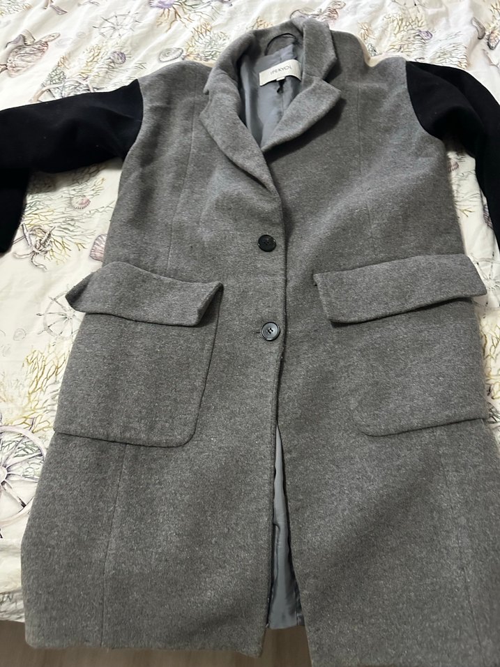 Gri yün görünümlü kumaş ve siyah kollara sahip kadın kabanı, iki ön kapaklı cep ve düğmeli kapama ile rahat bir iç astara sahiptir. Rahat kalıptır