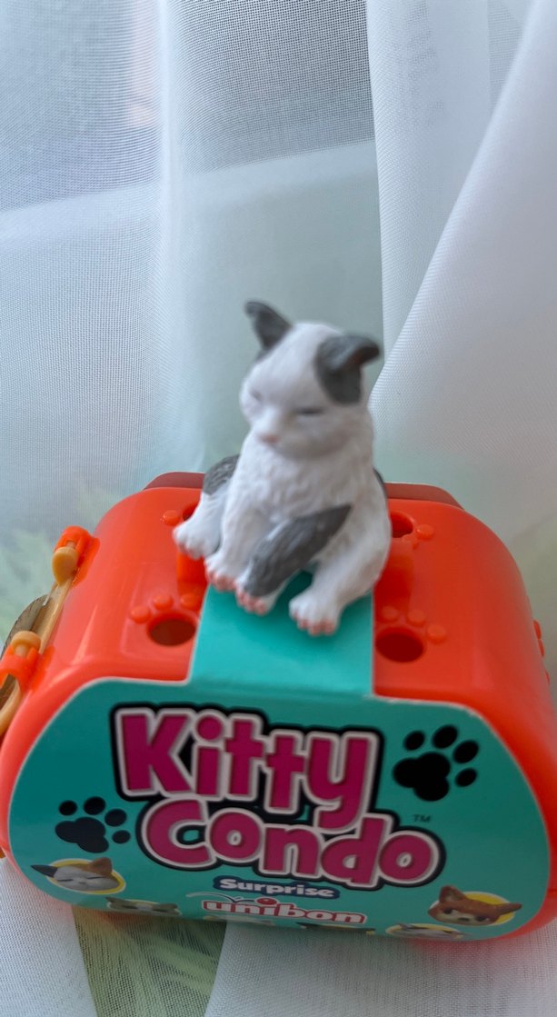 Gri renkte Kitty Condo kedi aksesuarı, üzerinde küçük bir kedi figürü bulunan renkli bir tabana sahiptir. Kedi temalı koleksiyonlara eğlenceli bir dokunuş katar.