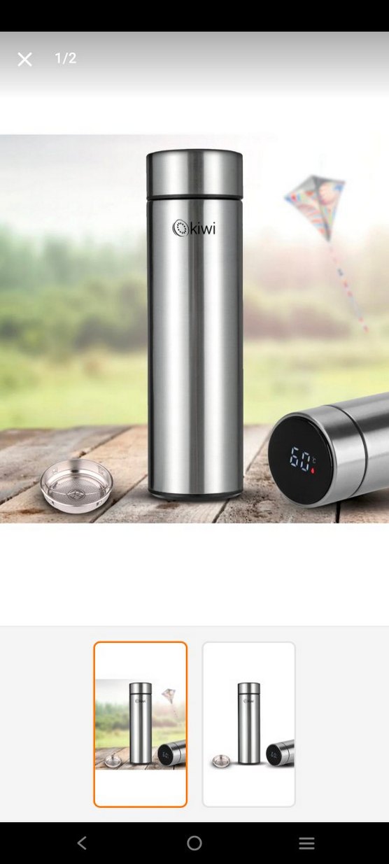 Gri renkli Kiwi termos şişe, kapağında dijital sıcaklık göstergesi ile içecekleri uzun süre sıcak veya soğuk tutar. Çocuklar için uygundur.