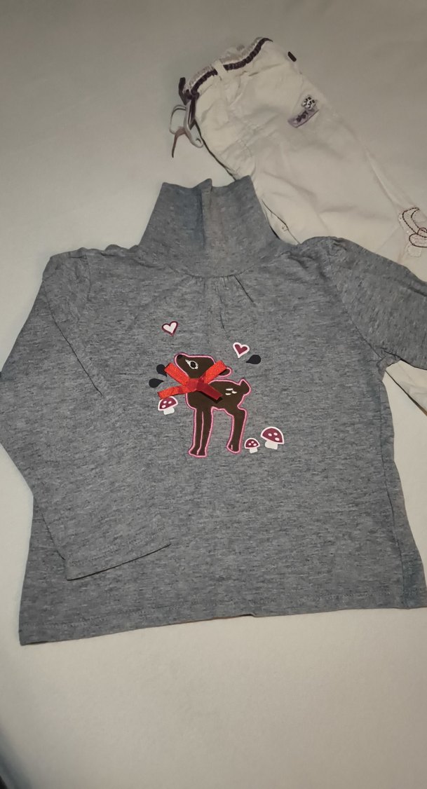 Gri renkli, balıkçı yaka ve uzun kollu kız sweatshirtü, yumuşak örgü fleece kumaştan üretilmiştir. Üzerinde kalpli geyik ve mantar baskısı vardır. krem rengi pantolon 1-2 yaş
