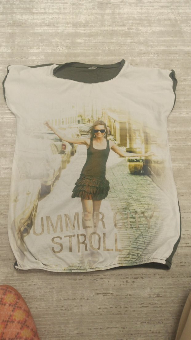 Gri renk, bol kesim, kısa kollu, bisiklet yaka kız tişörtü, baskılı yaz şehir temalı tasarıma sahiptir.