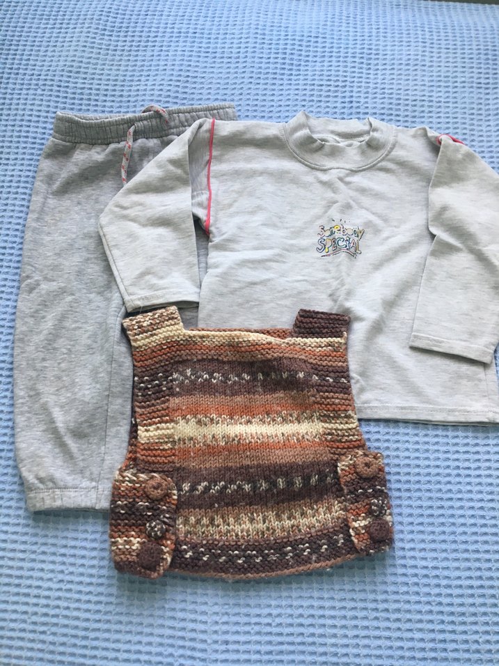 Gri uzun kollu triko üst, eşleşen triko pantolon ve çok renkli örme yelekten oluşan kız bebek takımı. Rahat ve günlük kullanıma uygun.
