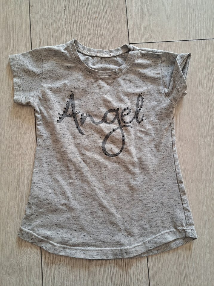 Gri renkte, kısa kollu ve yuvarlak yakalı kız çocuk tişörtü. 'Angel' baskılı, örme keten kumaştan, bol kesim ve sokak stili için uygun.