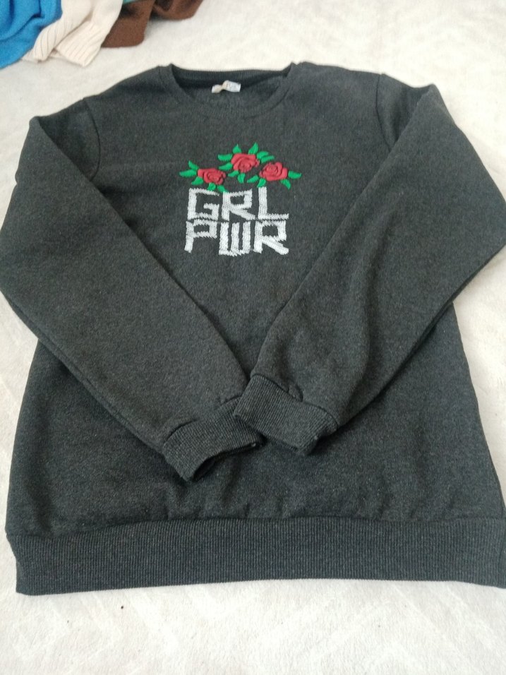 Gri renkli, uzun kollu ve bisiklet yakalı bu sweatshirt, bol kesimi ve örme dokusuyla rahat bir kullanım sunar. Üzerinde kırmızı güllerle süslenmiş GRL PWR baskısı bulunur.