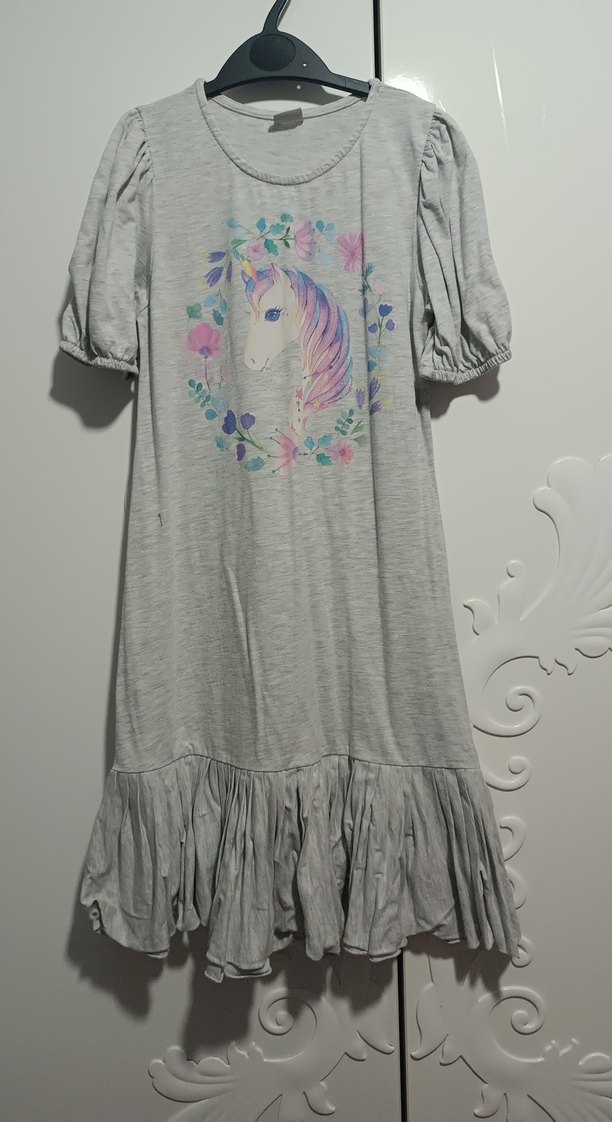 Gri renkte, kısa kollu ve fırfırlı kız çocuk elbisesi. Rahat kesim, baskılı tek boynuzlu at ve çiçek desenli, yumuşak sentetik kumaştan, yuvarlak yaka.