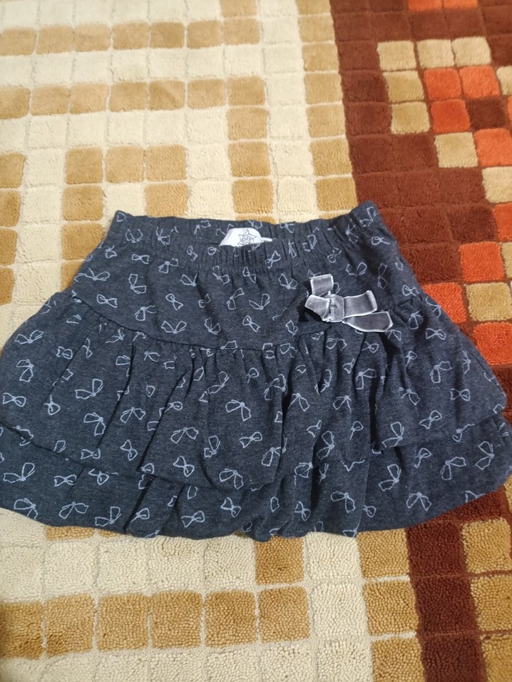 Gri renkli kız çocuk eteği, bol kesim ve fırfır detaylara sahiptir. Yumuşak ve sıcak kumaştan yapılmış, küçük bir fiyonk süsü bulunur.
