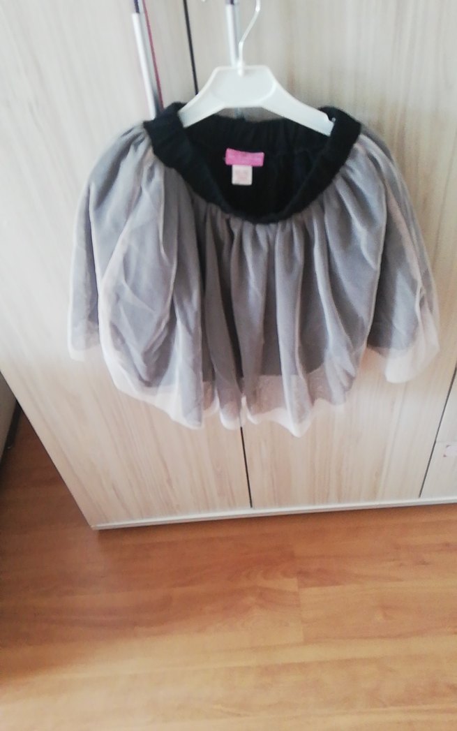 Gri renkli, sentetik kumaştan yapılmış, bol kesim ve fırfırlı kız çocuk eteği.