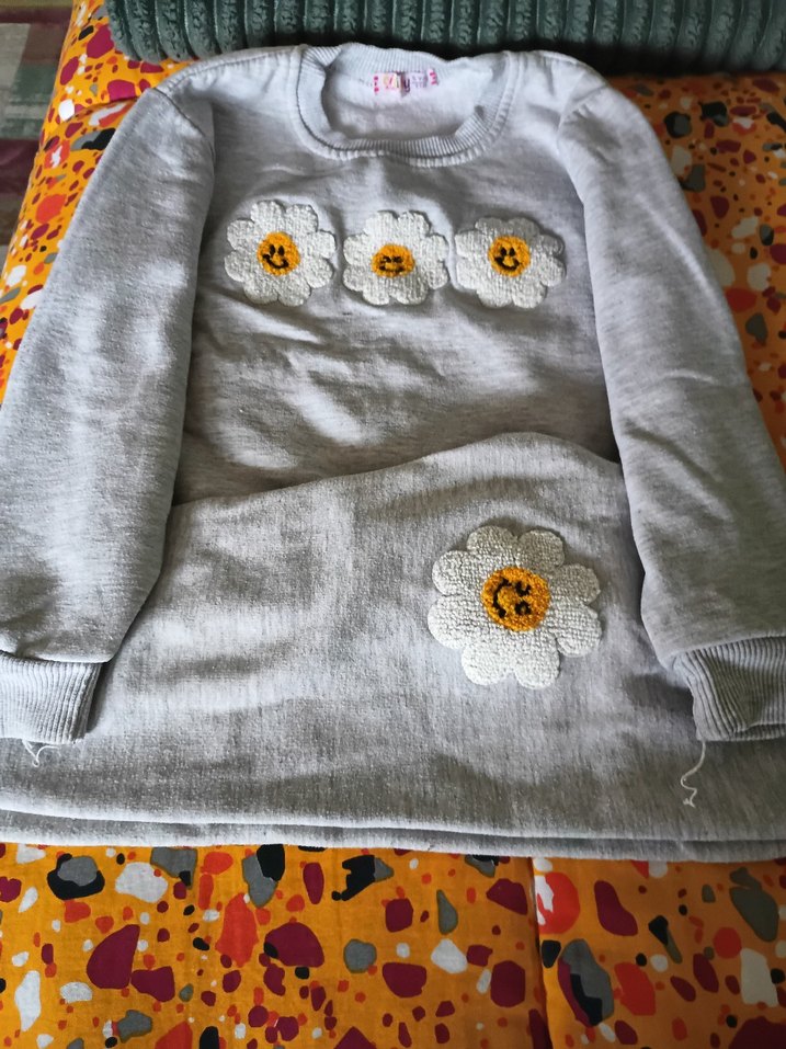 Gri renkli, yuvarlak yaka ve uzun kollu kız çocuk sweatshirtü, işlemeli gülen çiçek desenleri ve düğme detayları içerir.
