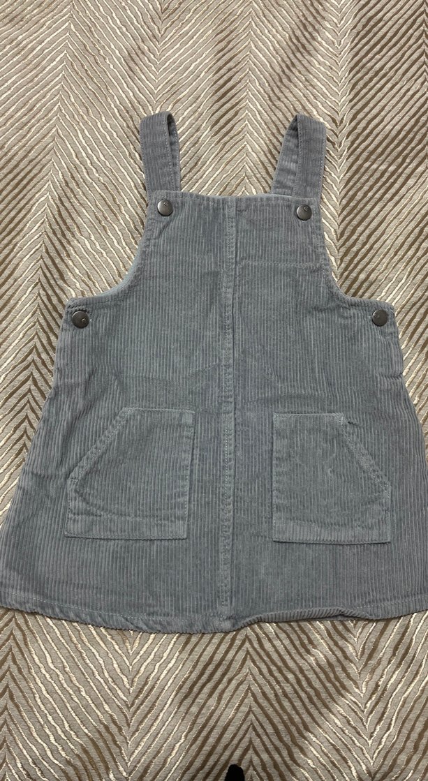Düğmeli, yüksek yakalı, gri kadife kumaştan, kolsuz ve vücuda oturan kız çocuk elbisesi.