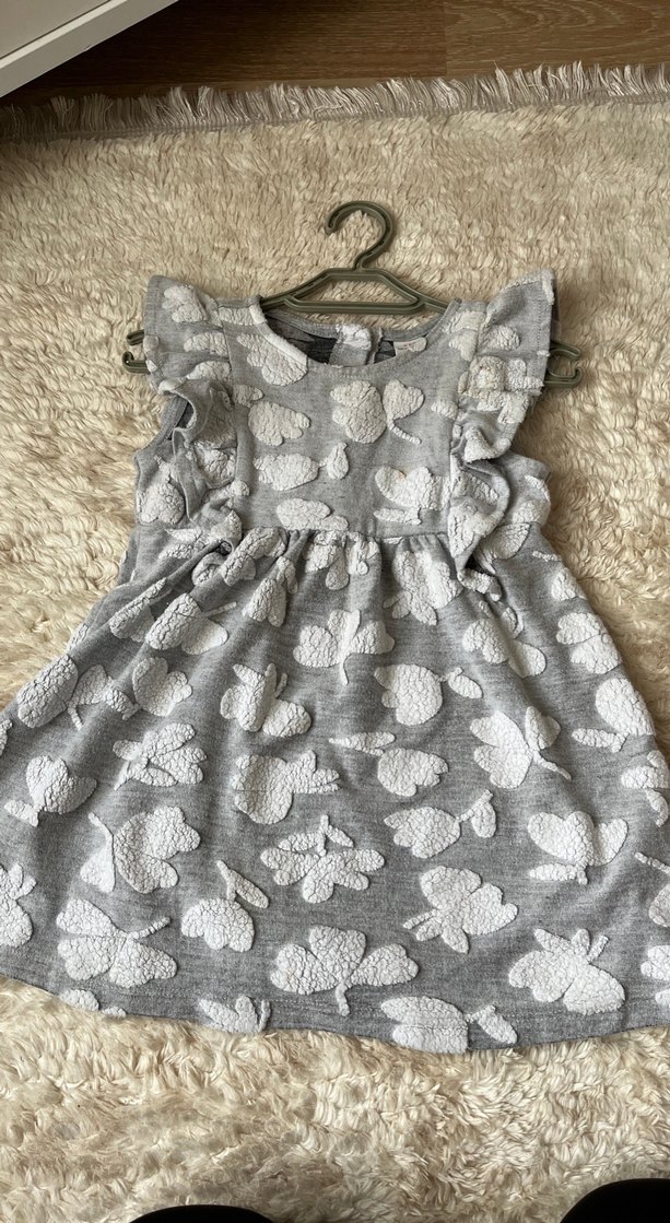 Yumuşak ve sıcak kumaştan, nakışlı desenlere ve fırfır detaylara sahip, kolsuz gri elbise. Rahat kullanım için bol kesim ve yuvarlak yaka bulunur.