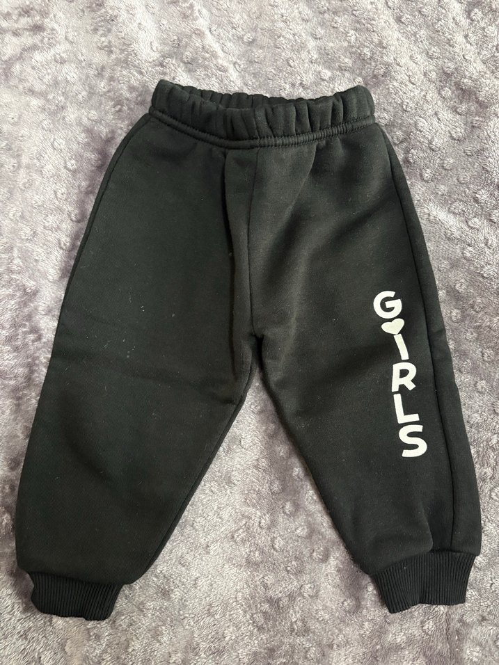 Gri renkte, bol kesim kız çocuk eşofman altı, yumuşak ve sıcak kumaştan, elastik bel ve paçalarla, "GIRLS" baskılı.