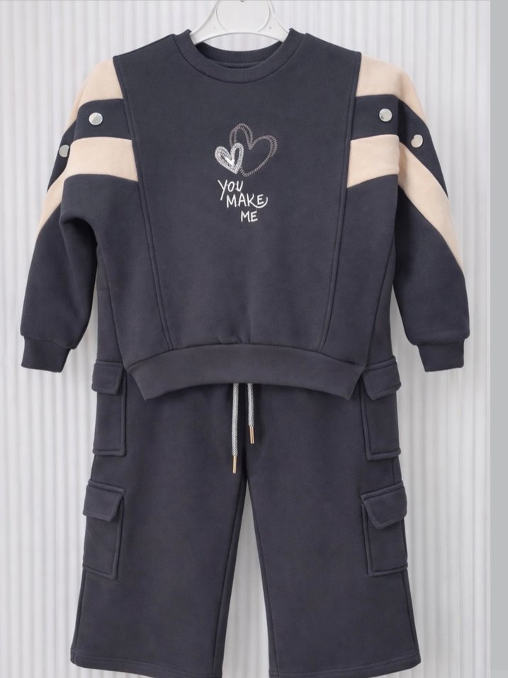 Gri renkli, rahat kesim, yumuşak kumaş,%100 pamuklu kız çocuk ikili takımı. "YOU MAKE ME" baskılı baskı bulunur. Altında cep detaylı pantolon vardır.
