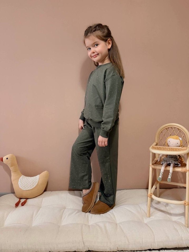 haki renkte, bol kesim kız çocuk sweatpant ve sweatshirt takımı. Uzun kollu, yuvarlak yaka ve yumuşak, sıcak tutan kumaştan yapılmıştır. Rahat ve şık normcore tarzda.