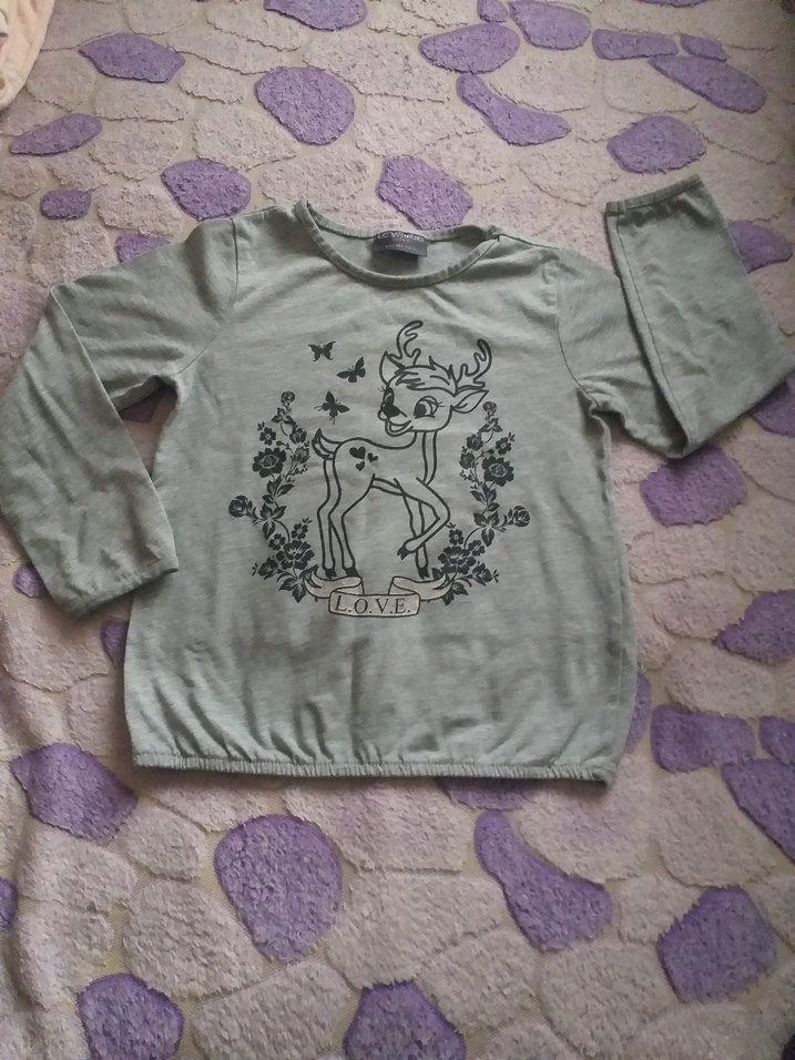 Gri renkli, uzun kollu kız çocuk tişörtü, bol kesim ve yuvarlak yaka ile. Yumuşak örme kumaştan, önünde baskılı geyik ve çiçek deseni bulunur. boyu 39 santim iki kol arası 32 santim