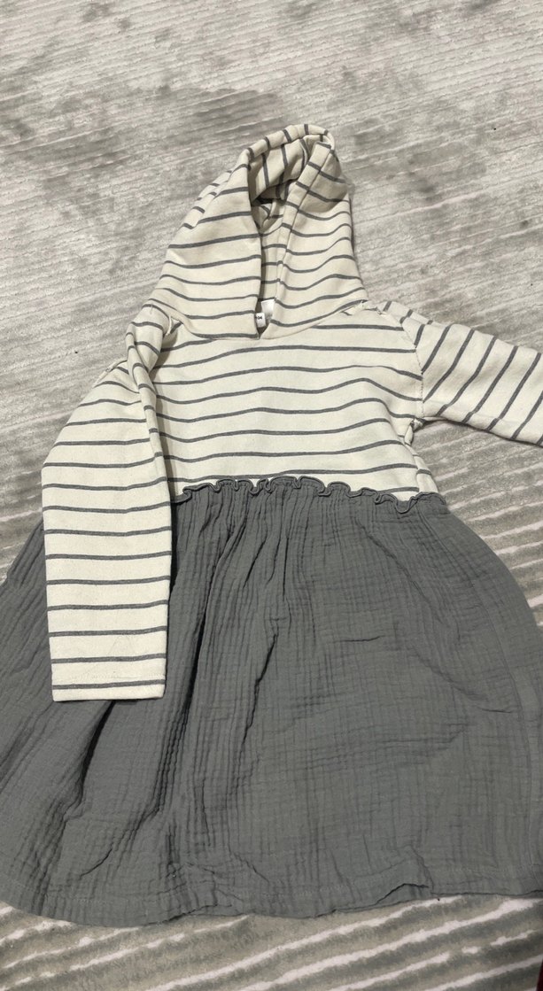 Bu bol kesim kız çocuk elbisesi, bisiklet yaka, uzun kollu ve bel kısmında fırfır detayı içerir. Çizgili üst ve düz gri etek yumuşak keten kumaştan yapılmıştır.