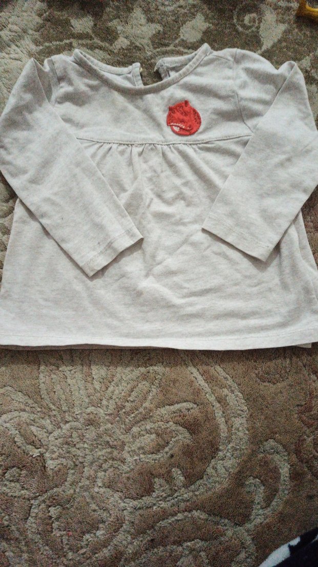 Gri renkte, keten kumaştan yapılmış, uzun kollu ve düğmeli detaylı salaş kesim kız çocuk bluzu. Göğüste küçük kırmızı bir işlemeye sahiptir.