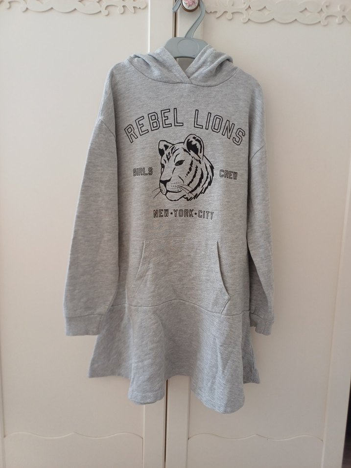 7-8 yaş Gri renkli, uzun kollu ve kapüşonlu bu sweatshirt elbise, bol kesim ve baskılı aslan figürü ile rahat bir sokak stili sunar. Önde ceplidir. Boyu 64cm dir.Temiz kullanılmıştır.