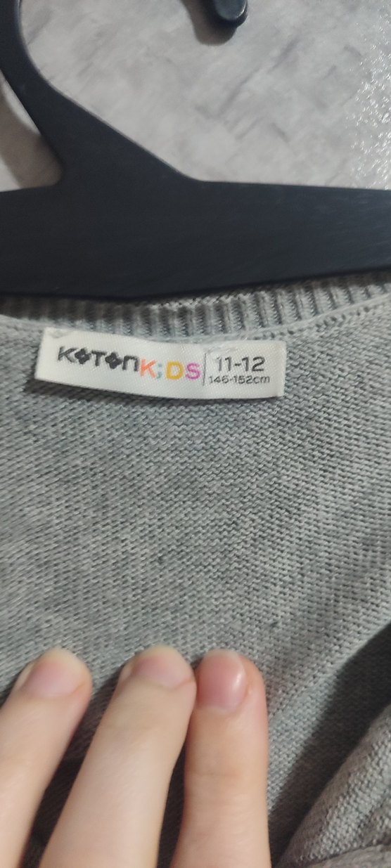 Gri örgü kadın kazak, yuvarlak yaka ve uzun kolludur. Baskılı desene sahip, bol kesim ve normal midi boydadır. Günlük rahat kullanıma uygundur. Koton Kids, 11-12 yaş (146-152 cm). çok iyi durumda ürün sıfır gibi bir kaç kez giyildi