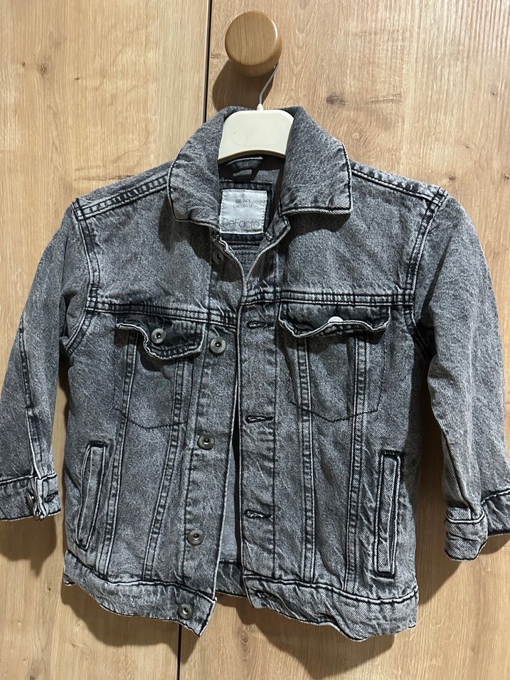 Gri renkli, düğmeli kız denim ceketi, bol kesim ve kesik yakasıyla modern sokak tarzı sunar.