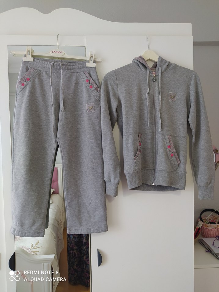 Yumuşak kumaştan, fermuarlı kapüşonlu ve uzun kollu gri kız eşofman takımı, bol kesim, rahat sokak stili.Bir İki defa kullanıldı tertemiz 7 8 yaşa uyumludur.Alt esortma boyu 79cm.Beli 75cm.Ust iki kolarasi 44cm kaliteli kumaşa sahiptir