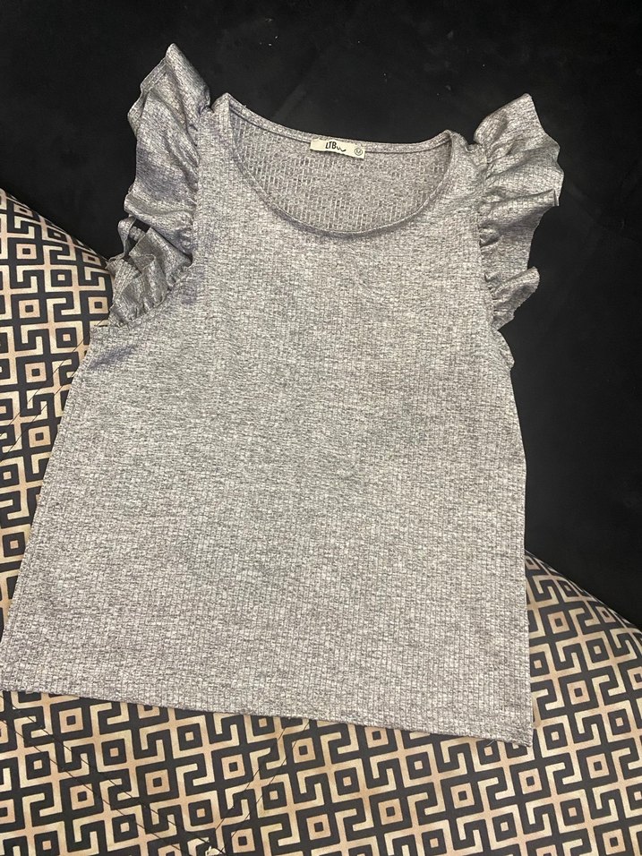 Kolsuz, gri renk bluz, omuzlarında fırfır detaylı ve bol kesimlidir. Yuvarlak yaka ve baskılı tekstil kumaştan yapılmıştır, günlük kullanıma uygundur.