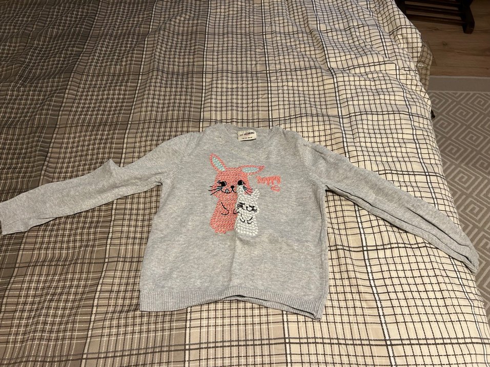 Gri renkli, örgü kumaştan yapılmış, bol kesim ve yuvarlak yakalı kız kazak. Üzerinde sevimli iki tavşan baskısı bulunur.