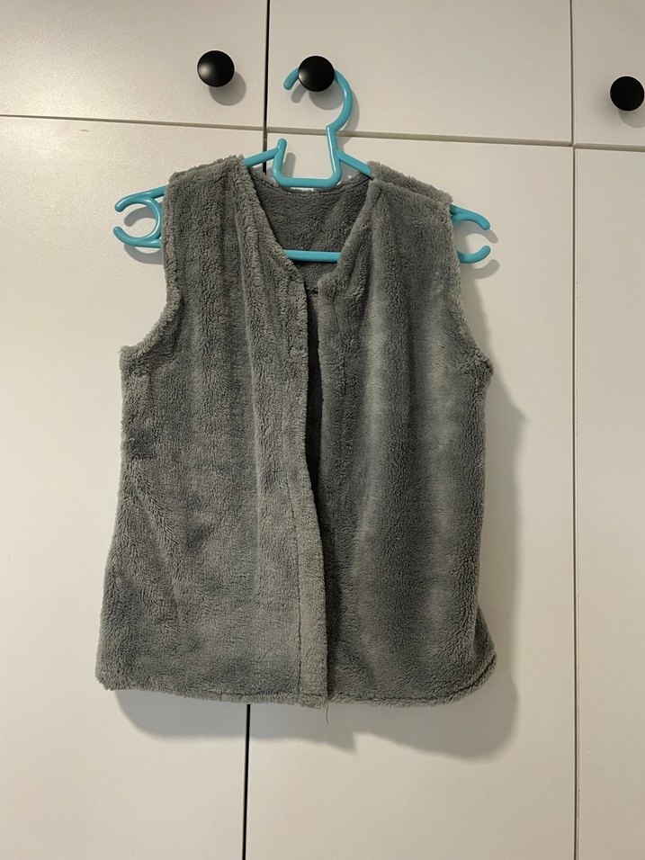 Yüksek yakalı, kolsuz kız yeleği, yumuşak peluş dokulu ve tüylü detaylıdır. Bol kesim ve sade gri renktedir.