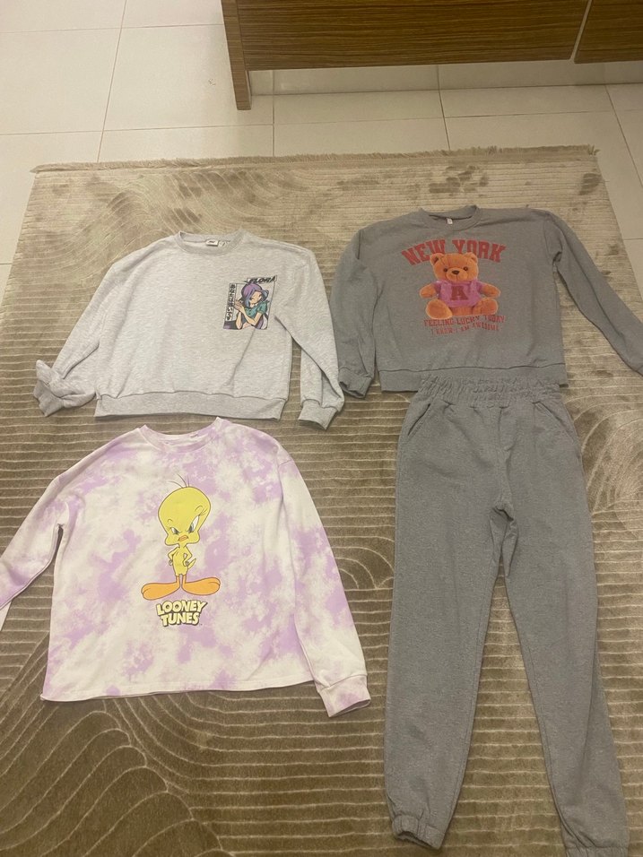 Gri renkli, uzun kollu, crew neck sweatshirt ve bol kesim eşofman altından oluşan takım. Sweatshirt üzerinde tie-dye desen ve çizgi film baskıları bulunur. Rahat ve şık bir günlük kombin.