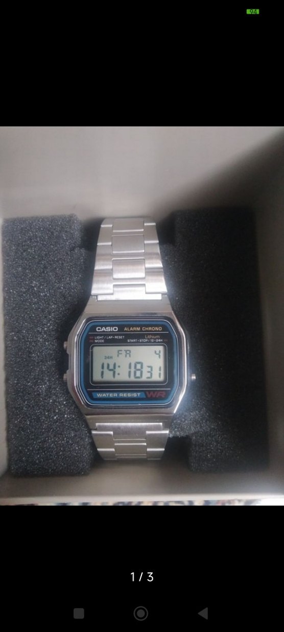 Gri Casio kadın kol saati, tokalı metal kayış ve alarm, kronometre, su geçirmez özelliklere sahip dijital ekran sunar. ⌚